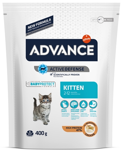 De eerste maanden van zijn leven groeit jouw kleine kitten het hardst, en daarom is gezonde voeding tijdens deze periode zeer belangrijk. In Advance Kitten vind je alles wat jouw katje nodig heeft! Dit smakelijk voer is gemaakt op basis van licht verteerbare kip en rijst voor een goede darmwerking. Er zijn nucleotiden aan het voer toegevoegd: deze vindt je normaal in moedermelk, waar ze zorgen voor een goede ontwikkeling van jouw kat. Omega 3, taurine en mineralen zorgen niet alleen voor een goede weerstand, maar ook voor een optimale urine-Ph, om de kans op blaasproblemen op latere leeftijd te verminderen. Advance Kitten heeft bovendien een hoge acceptatie en zal ook bij jouw kitten in de smaak vallen!