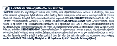 Analytische bestanddelen: Eiwit (26%), vetgehalte (17%), ruwe vezels (3%), ruwe as (6,5%), Omega 3 (0,3%) en Omega 6 (3,1%)