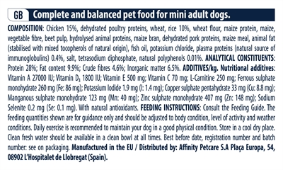 Samenstelling: Kip (15%), volkoren tarwe (12%), gedehydreerde eiwitten van pluimvee, rijst (10%), erwtenvezel, tarwemeel, maïseiwit, gedehydreerde eiwitten van varken, volkoren maïs, gehydrolyseerde dierlijke eiwitten (gevogelte, varken, vis), maïszemelgrint, bietenpulp (1,7%), maïsmeel, pluimveevet, tarwevoerbloem, chicorei-inuline (0,8%), mineralen, visolie, plasma-eiwitten van varken (natuurlijke bron van immunoglobulines) (0,4%).