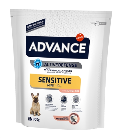 Advance Mini Sensitive 800 gram is een smakelijk hondenvoer speciaal gemaakt kleine honden (tot 10 kg) met een gevoelige maag of huidproblemen. Veelal hebben honden met maagproblemen klachten aangaande de vertering en de huid. Dit voer haalt eiwit uit slechts één eiwitbron (zalm) en de combinatie met rijst maakt het voer gemakkelijk verteerbaar. Toch bevat het voer alles wat jouw hond nodig heeft, zoals n Omega 3 en 6 vetzuren voor een gezonde huid en vacht. Daarnaast zijn de brokken zeer smakelijk, voor een goede acceptatie!