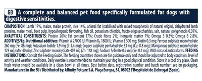 Samenstelling: Lamsvlees (17%), maïs, maïseiwit, rijst (14%), dierlijk vet (gestabiliseerd met een mengsel van tocoferolen van natuurlijke oorsprong), gedehydrateerde lamsvleeseiwitten, maïsmeel, bietenpulp, hypoallergene smaakstof, visolie, kaliumchloride, fructo-oligosachariden, zout, natuurlijke polyfenolen (0,01%).