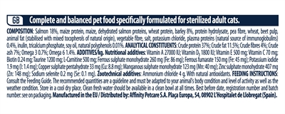 Analytische bestanddelen: Ruw eiwit (34%), ruw vet (13%), ruwe vezel (1,5%), ruwe as (7,5%), calcium (0,9%), fosfor (0,85%), natrium (0,8%), kalium (1%), magnesium (0,07%), chloride (2,2%), zwavel (0,5%) en L-tryptofaan (0,35%).