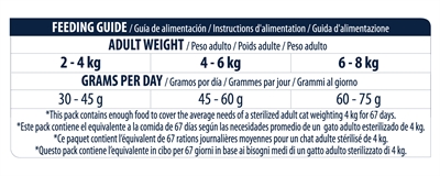 Samenstelling: Kip (18%), rijst (18%), gedehydrateerde pluimveeproteïnen, maïsproteïne, maïsmeel, reuzel, gehydrolyseerde dierlijke eiwitten (pluimvee, varken, vis), zout, kaliumchloride, bietenpulp (0,8%), visolie, fructo-oligosachariden, gehydrolyseerde visproteïnen (bron van vispeptiden) (0,08%), citroenmelisseconcentraat (0,08%), glucosamine (335 mg/kg), chondroïtinesulfaat (85 mg/kg).
