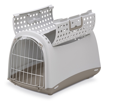 Imac Reismand Linus Cabrio Lichtgrijs 50X32X34,5 cm is een moderne transportbox voor de hond of kat van sterk plastic, met veel ventilatie en ijzeren traliedeur.