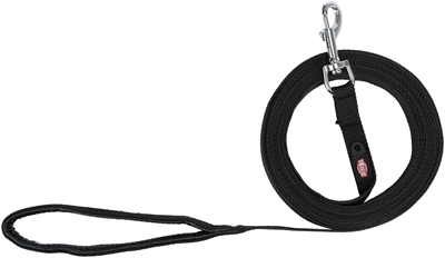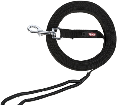De Trixie Sleeplijn Singelband Zwart 20 mm X 5 mtr is een hondenriem met een lange lijn voor bewegingsruimte, geschikt voor speurwerk. Door de lengte van deze lijn heeft de hond zeer veel bewegingsruimte. Hierdoor is de lijn uiterst geschikt voor speurwerk, tijdens de jacht en voor hondentraining (voor bijv. het aanleren van commando's op afstand). De lijn is gemaakt van hoogwaardig katoen, is breed zodat het veilig te hanteren is en heeft een gevoerde handgreep.