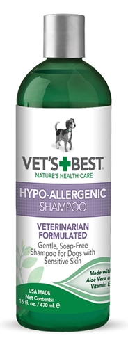 Vet's best hypo-allergenic hondenshampoo reinigt en hydrateert de gevoelige huid, verlicht jeuk en helpt de droge, broze vacht glad te maken. De shampoo is gemaakt van natuurlijke ingrediënten zoals aloë vera en vitamine E, en is zeepvrij. Het is ideaal voor honden met een gevoelige-, droge huid en seizoensgebonden allergieën en heeft geen invloed op actuele vlooien- en tekenmiddelen.